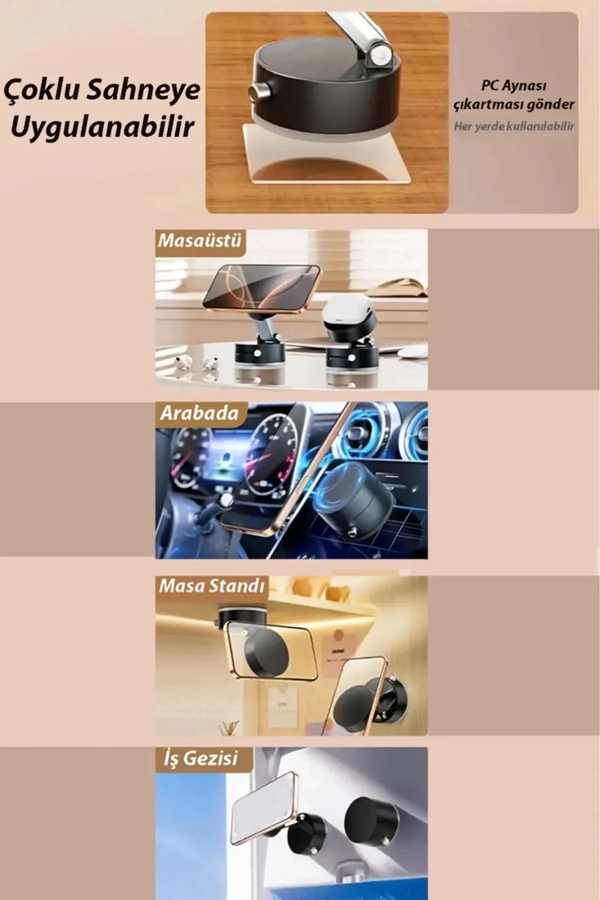 • Araç İçi Kullanım: Araba içindeki cam ya da düz yüzeylere montelenerek, telefonunuzu navigasyon, müzik çalma ya da eller serbest kullanım için güvenli bir şekilde tutar.